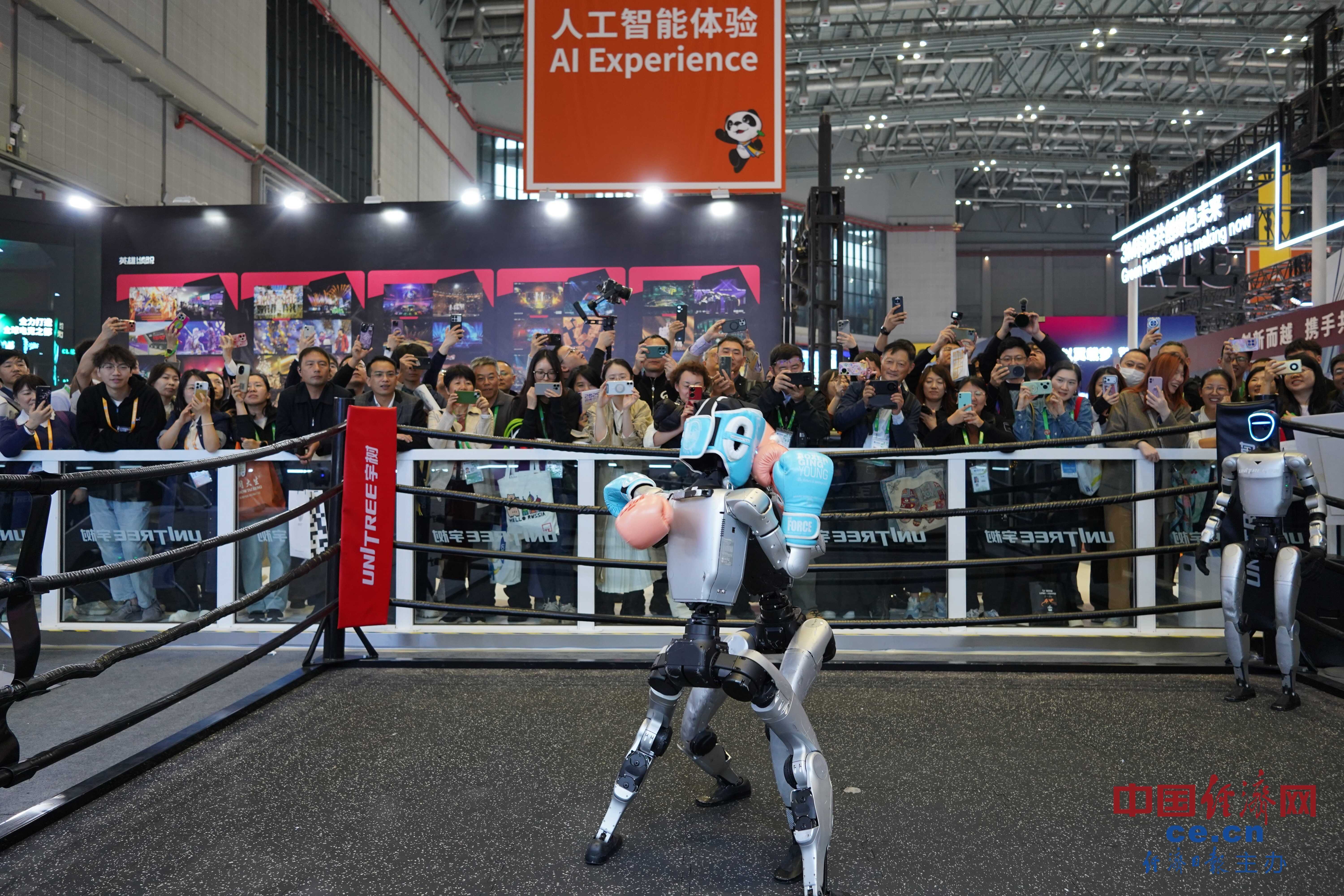 图为人工智能专区机械人拳击肉搏表演。本届进博会人工智能专区,11月5日至10日,本届进博会人工智能专区,第八届中国国际进口博览会(简称“进博会”)正在上海举办。展现了全球人工智能范畴最新的前沿手艺。中国经济网记者 马常艳 摄